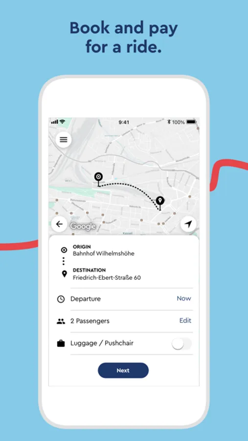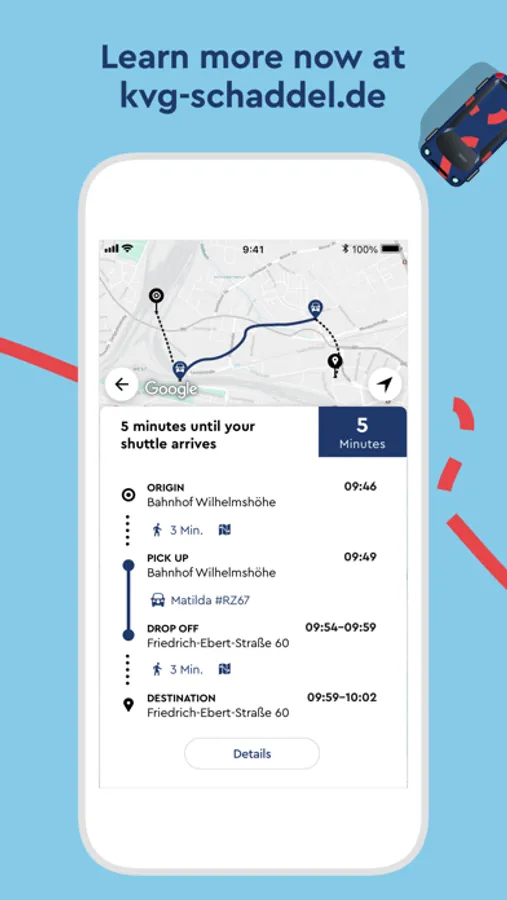 Schaddel is KVG's on-demand service and is now supplementing the bus and tram range with an attractive service late in the evening or at night for all Kassel residents and their guests. During the day, Schaddel in the Waldau industrial park and the Langes Feld industrial park ensures that all employees there, as well as companies and their customers, get the right offer. Fully electric, emission-free, digital and individually tailored to your needs. Rides with the Schaddel can be conveniently booked and paid for using the app. Schaddel brings its passengers flexibly directly to their destination or creates the connection to the next tram or bus stop. This makes using public transport even easier and more convenient. And this is how easy it works: Register once in the app and start driving straight away. Enter the start and destination address and the app will immediately show which vehicle will take over the journey, when it will arrive at the meeting point and how much the journey will cost. All you have to do now is book, pay automatically via the app and then you can start right away. Use the app's routing function to walk a few meters to the meeting point and track live in the app where the vehicle is at the moment and when it will arrive at the meeting point. After boarding, the Schaddel takes its passengers directly to their destination or to a virtual stop in the immediate vicinity of their destination. If bookings are received from other passengers en route who have a similar destination, these are combined into one trip. At the end of each ride, feedback can be given via the app.