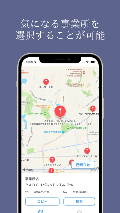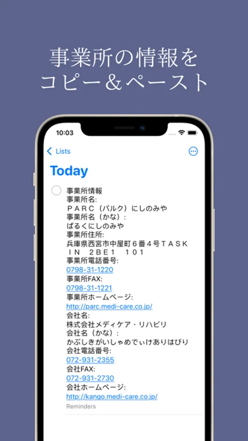 ・選択した事業所の情報をコピーすることができ、その情報を身近な方に、共有することができます。