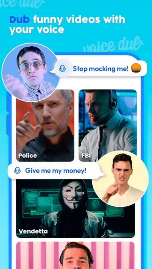 Voice dub is an app that allows you to create lip-sync videos. Designed for the new generation of creators, it allows you to quickly and easily create unique short videos to share with friends and the world.