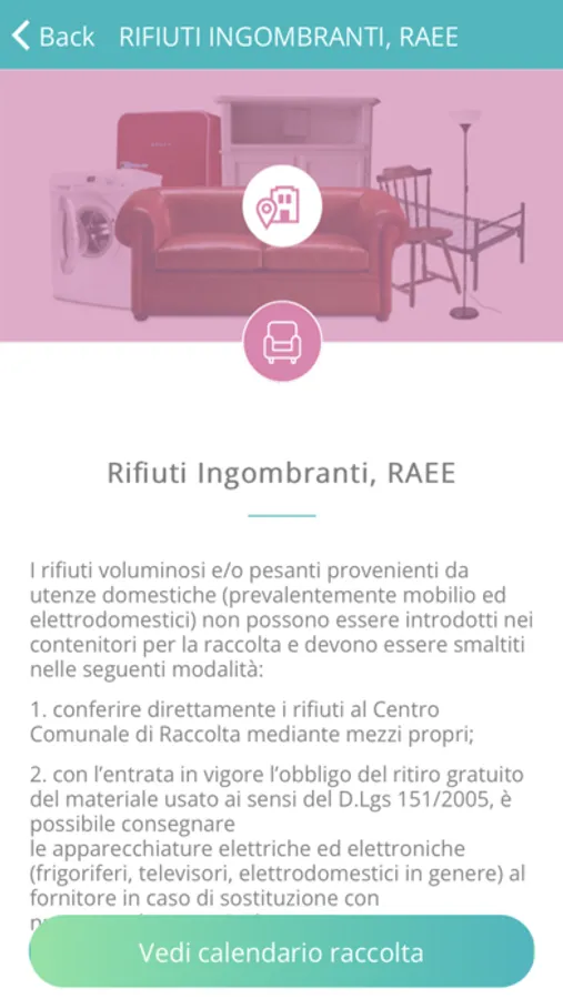 L’app offre all’utente una serie di funzionalità attraverso cui è possibile conoscere ed approfondire le modalità di conferimento dei rifiuti, ma è anche strumento utile per inviare segnalazioni e richieste di ritiro a domicilio, conoscere gli orari e i giorni di apertura del Centro di Raccolta, personalizzare le notifiche e tante altre funzioni.