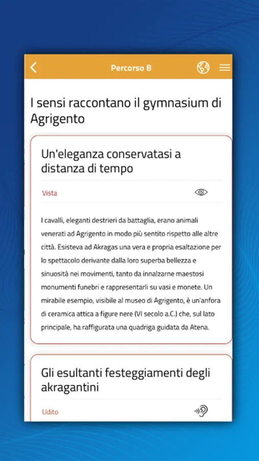 Nell’ambito del progetto, tutti i Siti vengono presentati con contenuti storico-artistici, correlati a percorsi multisensoriali. Ciascuno di essi è collegato ad ogni Bene e al territorio di appartenenza, in relazione alla storia e alle tradizioni locali. Ogni Sito è illustrato da differenti percorsi culturali che illustrano i Beni con diversi molteplici gradi di conoscenza. Il testo è, inoltre, fruibile in lingua inglese ed è accompagnato da video divulgativi, anche in LIS.