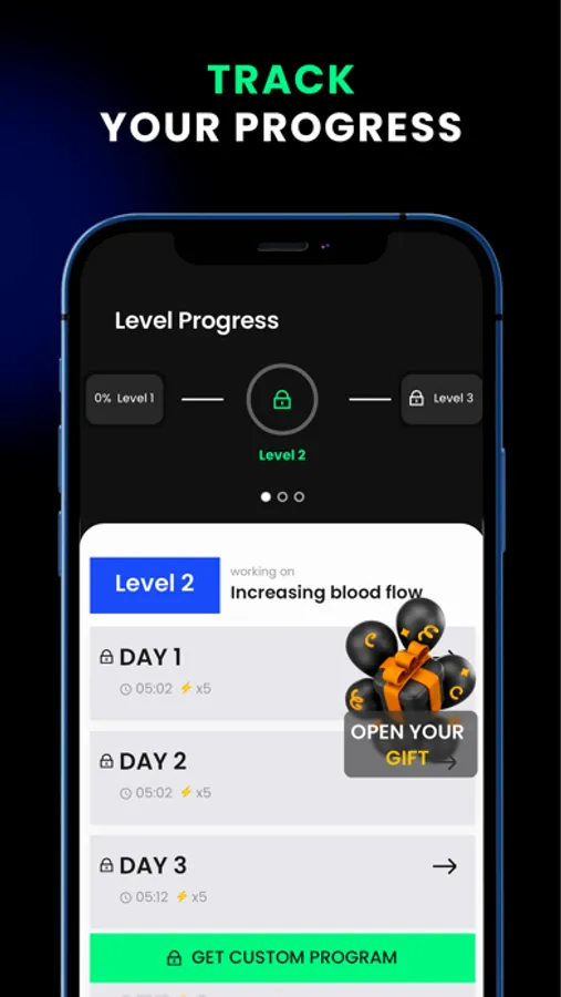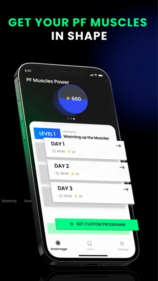 The app has the ability to see the number of workouts completed, the time spent training and your current level. We also introduced the PF Muscles Power metric, which visualizes your progress. For each workout you will be credited with units of energy. To maximally train your PF muscles you need to accumulate 1320 units of energy.