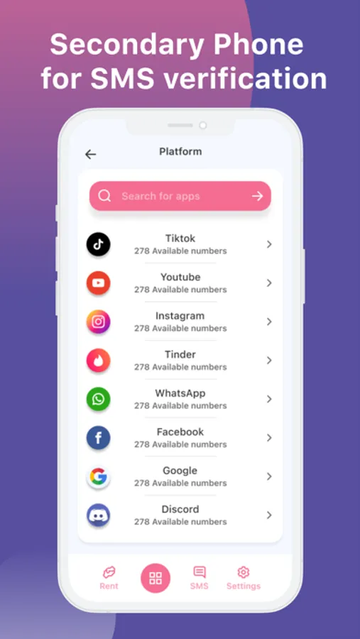 Keep your online identity and primary phone number safe. Create as many different accounts as you want for any app or website of your choosing. Try SMSimo today!
