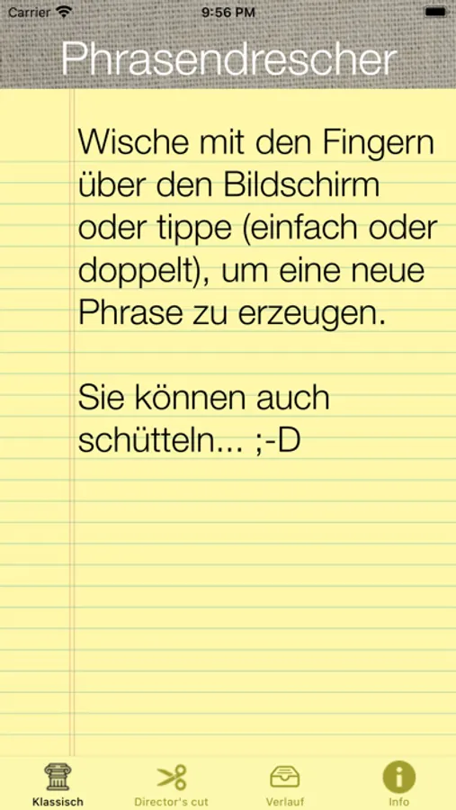 Wischen oder tippen Sie einfach auf den Bildschirm, um eine neue Phrase zu erhalten. Schütteln ist auch erlaubt...;-D