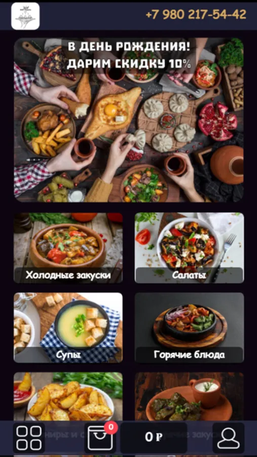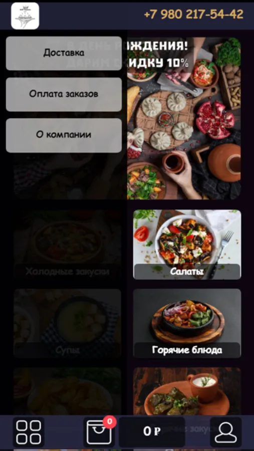 - огромный ассортимент (хинкали, холодные закуски, салаты, супы, горячие блюда, гарниры, горячие закуски, выпечка, блюда на мангале, десерты, хлеб, напитки);