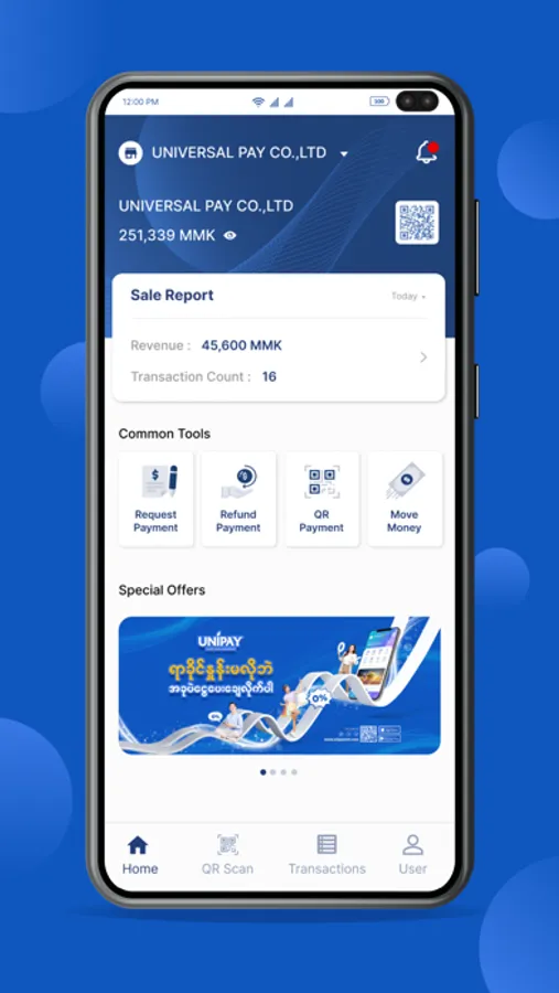 UniPay for Merchant is an APP for merchants to receive money from both local and overseas users. Merchants receive money in MMK while users pay in their local currencies.