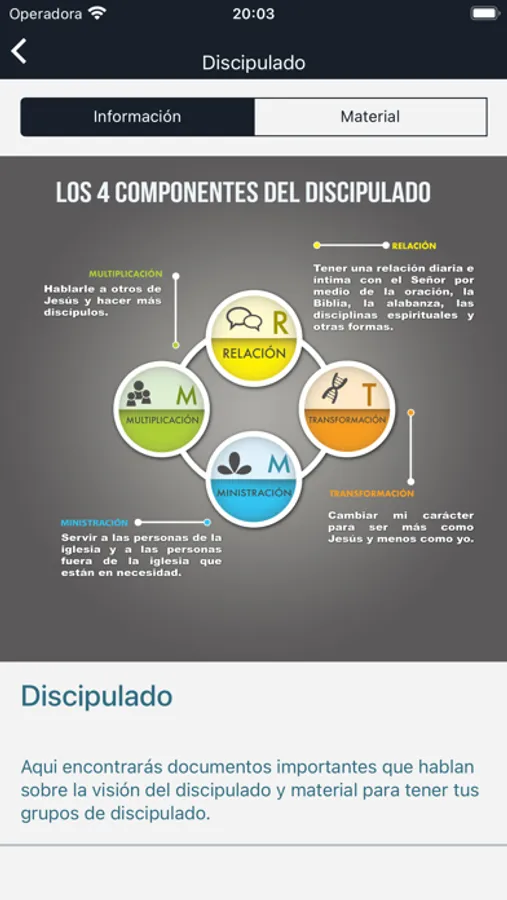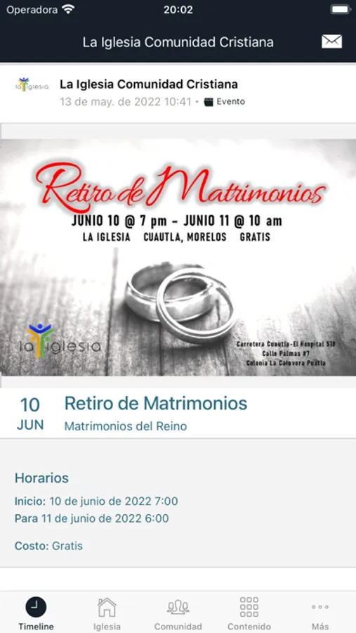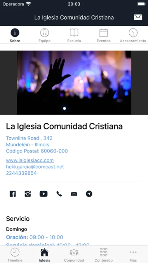 - Información de la iglesia (dirección, teléfono, sitio web, redes sociales, pastores)