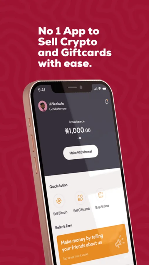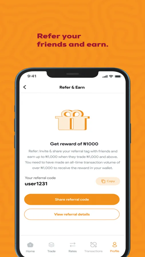 Share your referral code with family and friends and earn up to N1000 when they trade up to $1000 and above. Your referrals also get a signup bonus of N1000