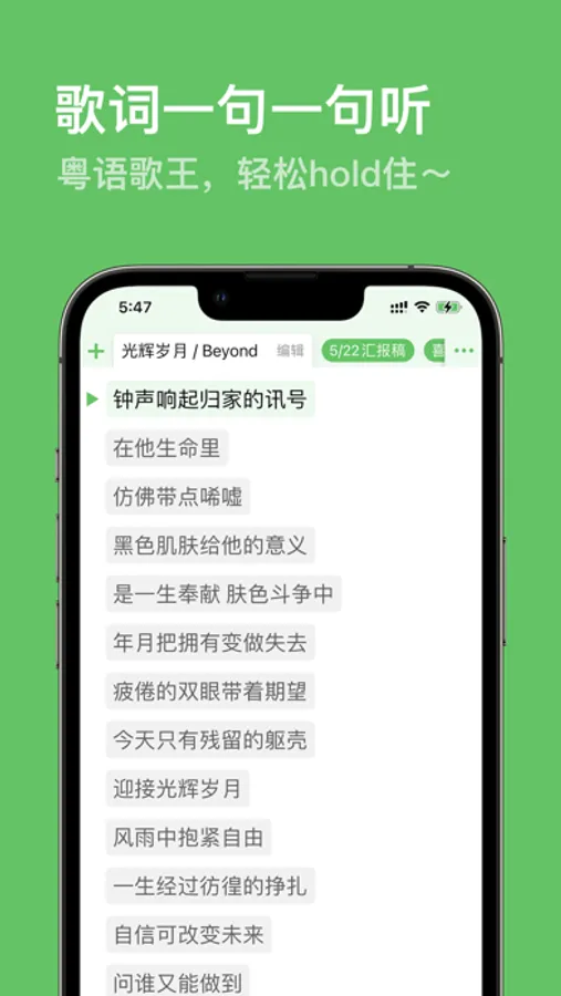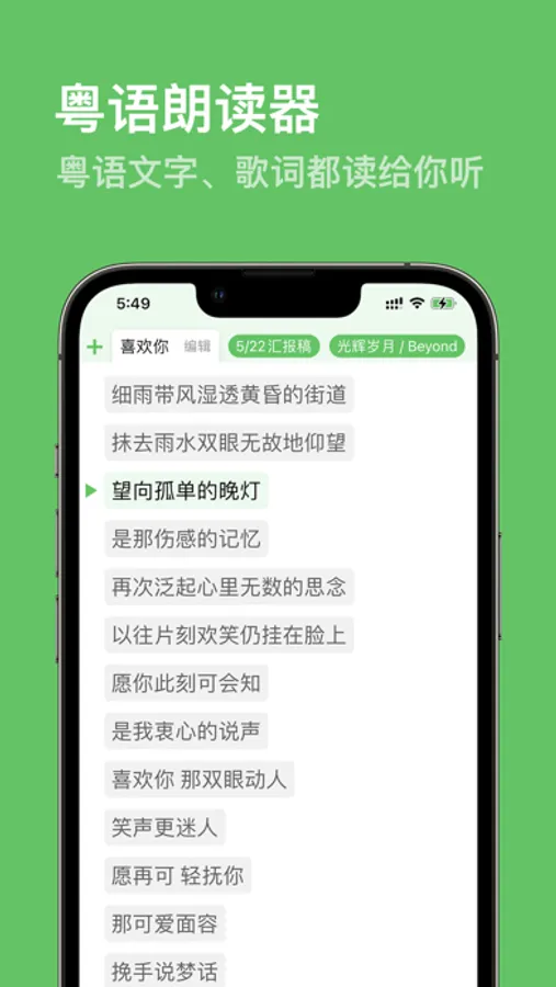该App可以使用到的场景包括:粤语一般学习和训练,粤语歌词的学习和模仿,粤语演讲稿的准备等等。