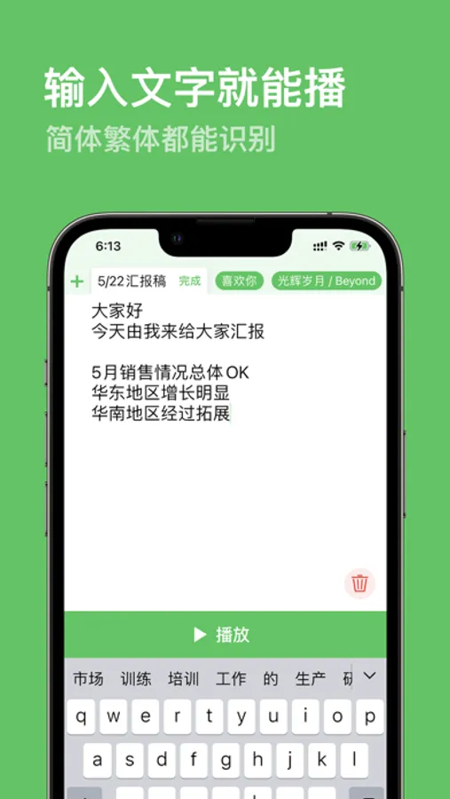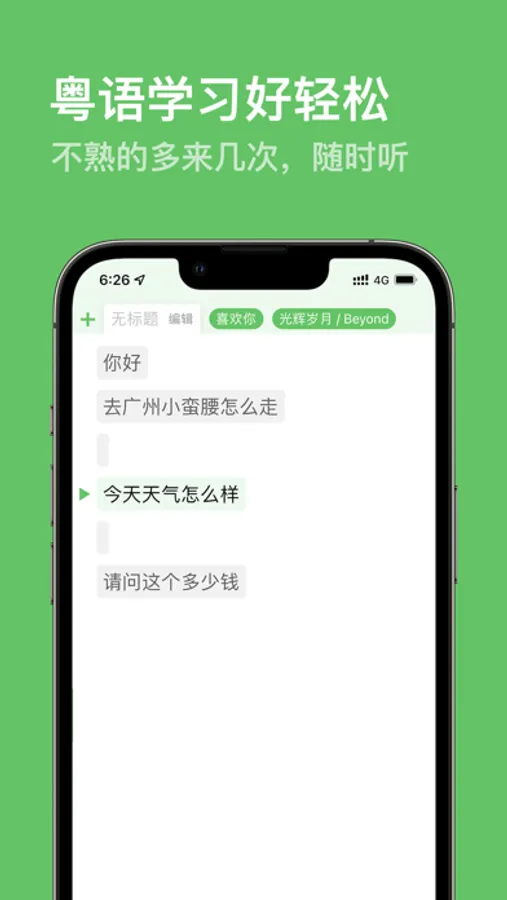 App内可以同时保存多个内容,通过顶部的加号和标签切换,方便随时反复收听和练习。