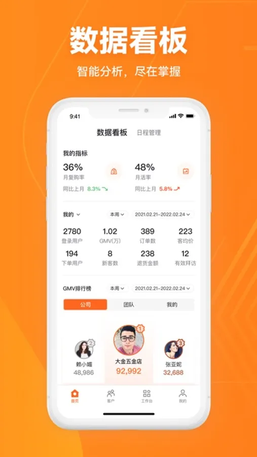 数据简报、业绩排行榜,实时更新业务全流程数据;随时随地,轻松掌握销售业绩、过程指标的变化。