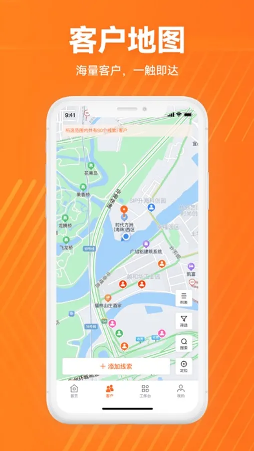 地图360全景式客户管理,一目了然;支持多类型条件筛选客户及当前定位查找客户,有效提升外勤人员人效。