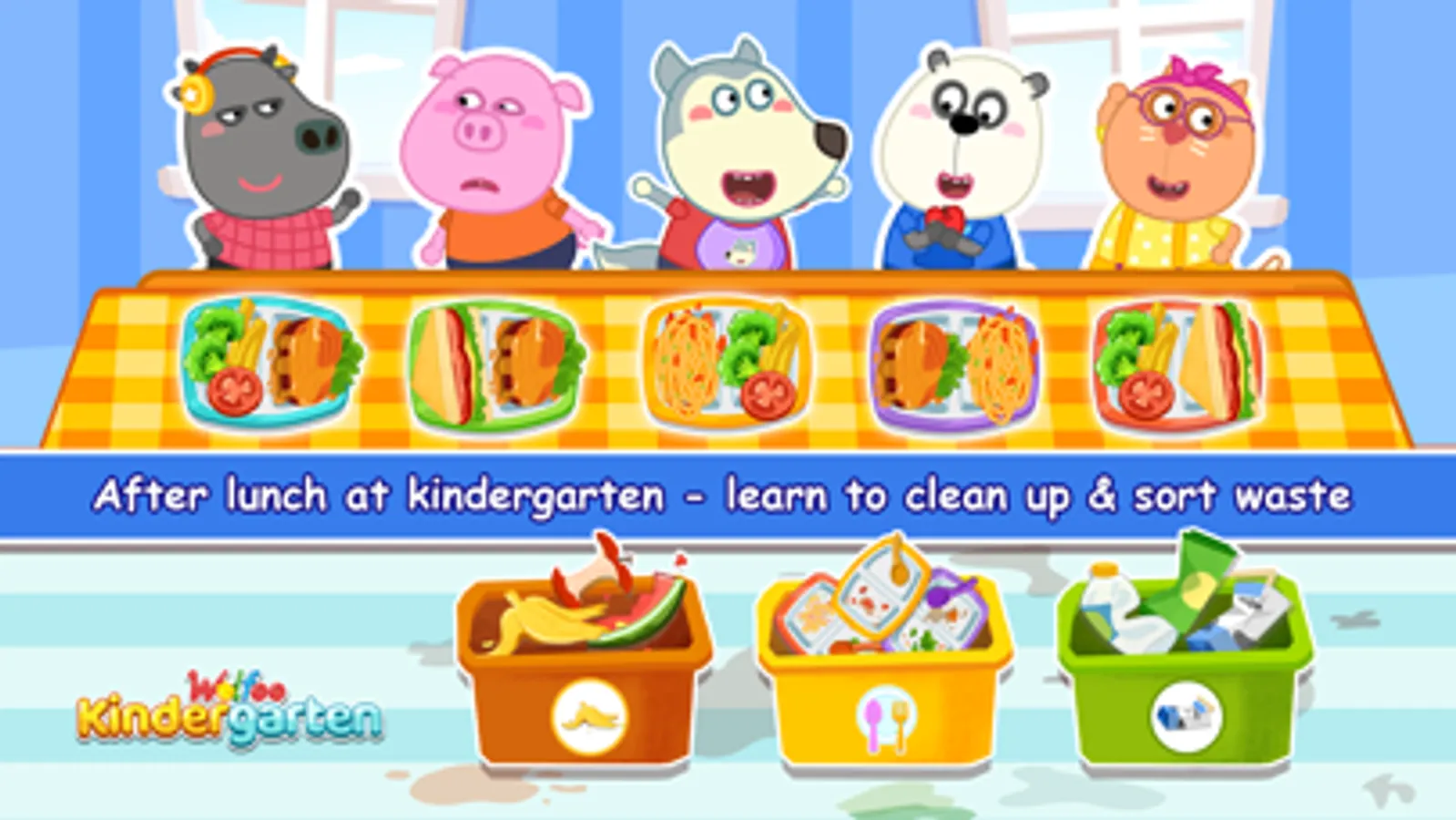 - Lunch and Clean-up: Teach your child about responsibility by helping Wolfoo and his friends prepare and clean up after lunch, sort waste to protect the environment through fun pre-k learning activities mini-game