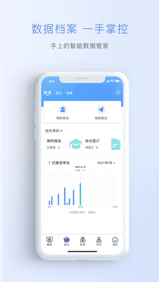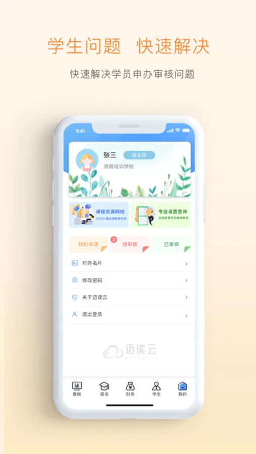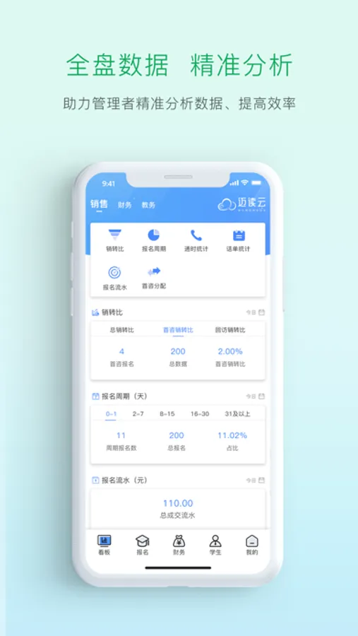 5、财务管理,报名实缴在线审批,提高效率。续费、退费提醒,避免错漏导致业绩流失。