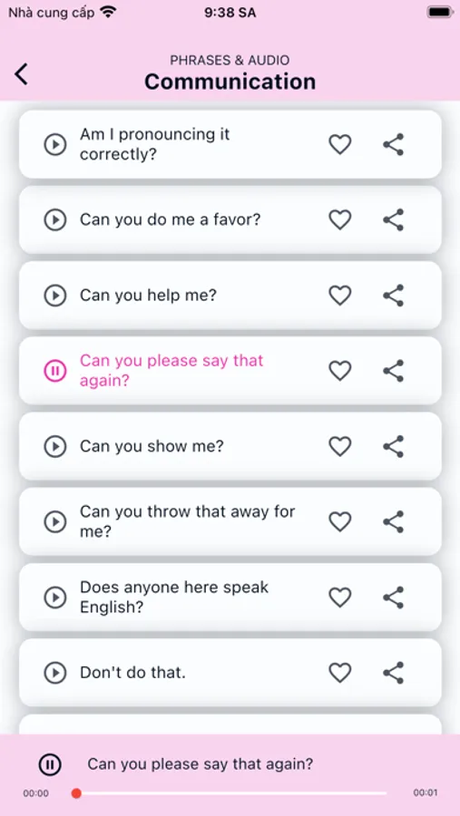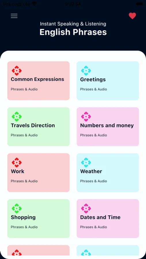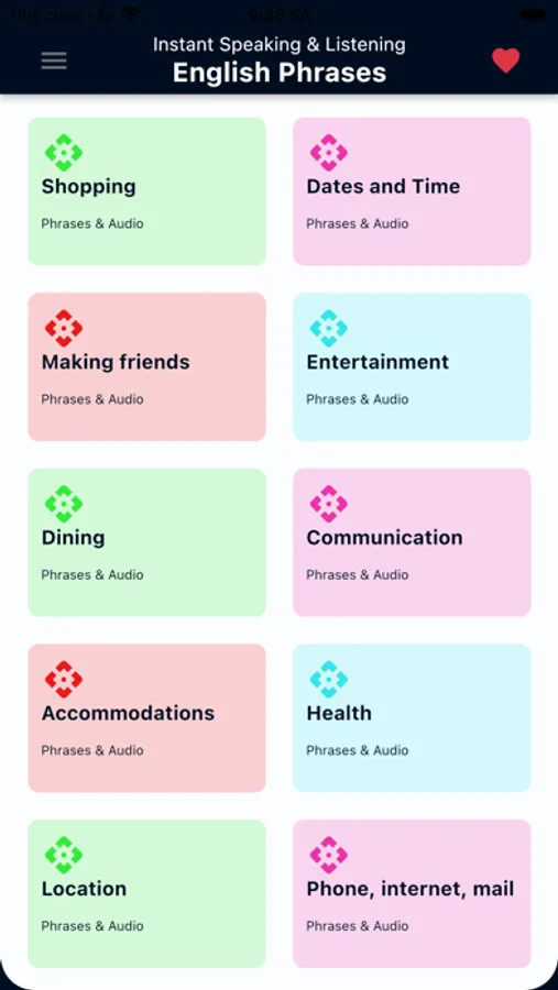 The goal of this app is to teach you English Phrases, not just individual English words, that you can use in many different situations. The phrases selected for this app are typical expressions used by native speakers. You can listen every phrase.