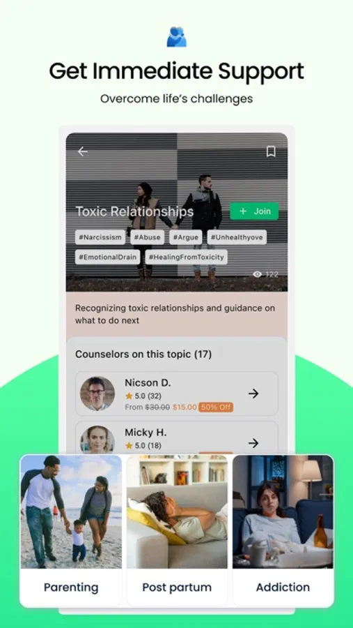 Find sensitive subjects that interest you, explore all the counselors that are willing to talk about that subject and engage in authentic conversations. Share diverse perspectives on a wide variety of topics including but not limited to mental health, breakup, toxic relationships, marriage problems, same sex, relationship, LGBTQIA, parenting, postpartum depression, self-respect, behaviour change, mindset, self-care, work-life balance, addiction, fetish, separation, anxiety, loneliness, trauma, abuse, narcissism, identity issues, gender transition, healing, wellbeing and many more, or you can just find someone to talk with.