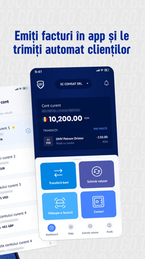 Vizualizezi sumele disponibile din contul favorit, compari sumele de plata vs de incasat și, de asemenea, ai imaginea ultimelor tranzacții efectuate