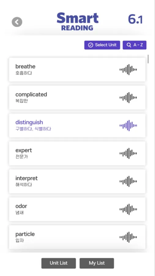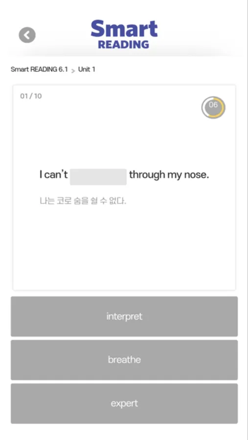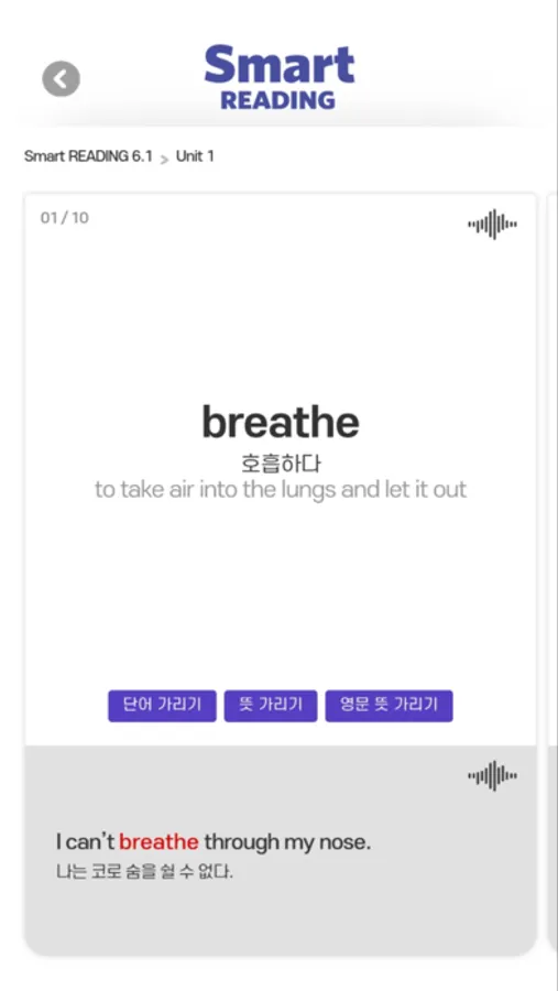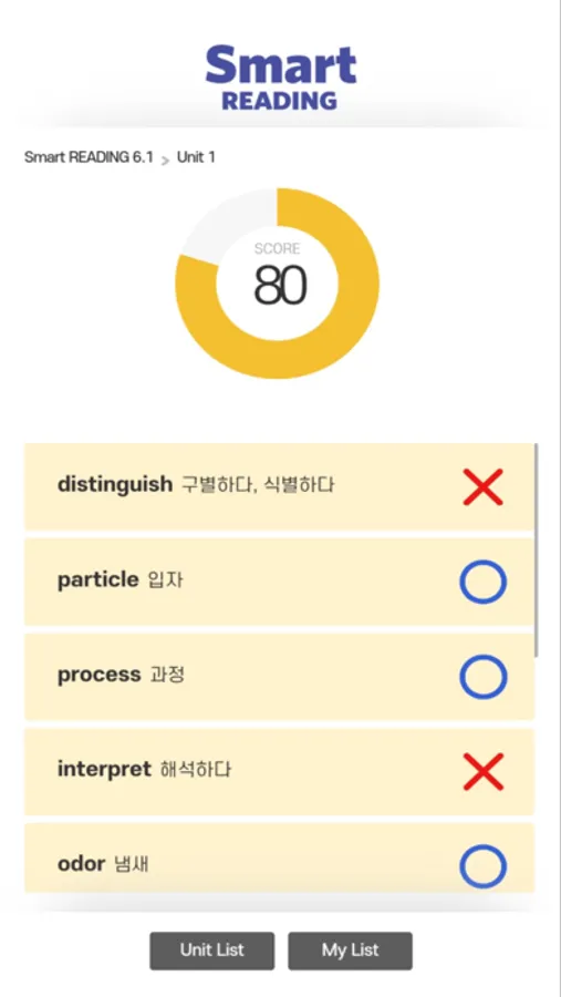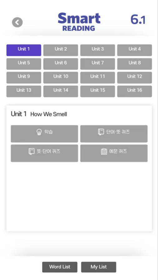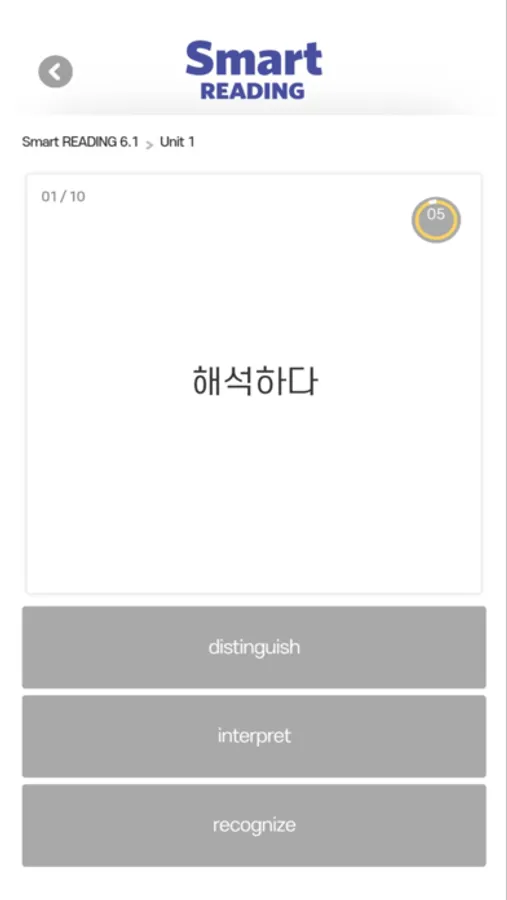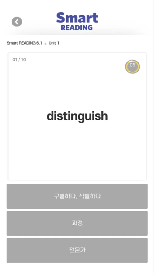 Smart Reading Word App은 Smart Reading 교재의 단어와 문장을 다양한 형태의 퀴즈로 복습할 수 있는 Word App입니다. 고학년 학습자의 레벨에 맞게 영문 뜻을 추가하여 학습 난이도를 한 단계 상승시켰으며, 학습자는 오답 노트 기능을 통해 틀린 단어를 반복해서 학습함으로써 완벽하게 익힐 수 있습니다.