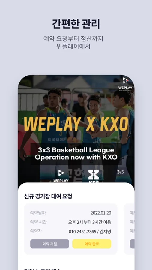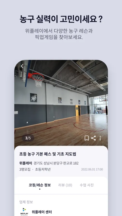 혼자서 즐기기 힘든 스포츠를 즐기기 위해 매칭, 경기장 대관, 레슨, 픽업게임, 대회 등의 서비스를 제공합니다.