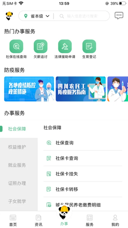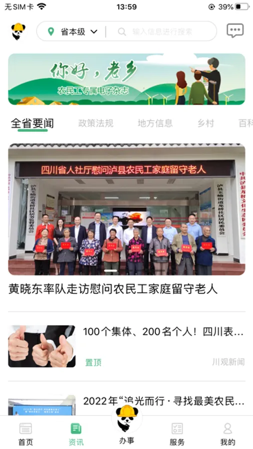 四川农民工服务平台是全国首个综合性农民工服务平台。平台围绕为农民工提供贴心服务保障这一核心要务,整合搭建信息资讯、在线办事、互动交流三大服务体系,提供政策解读、地方资讯、电子杂志、就业招聘、创业指导、权益维护、网络培训、普惠金融、专家云问诊、积分商城等特色服务及社会保障、证照办理、婚姻生育、交通出行等均等化公共服务,旨在为川籍农民工提供优质、高效、便捷的专属服务,实现“一部手机安心闯天下”。
