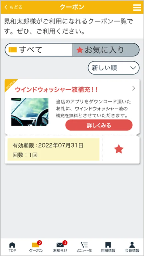 当社の公式アプリ「洗車専門店 カーティフル」は給油・カーメンテナンス・洗車・カーコーティングをするたびにスタンプが貯まり、決められたスタンプ数を貯めるとお得なプレゼントクーポンと引き換えができる、貯めて楽しいもらえて嬉しいお得なアプリです。