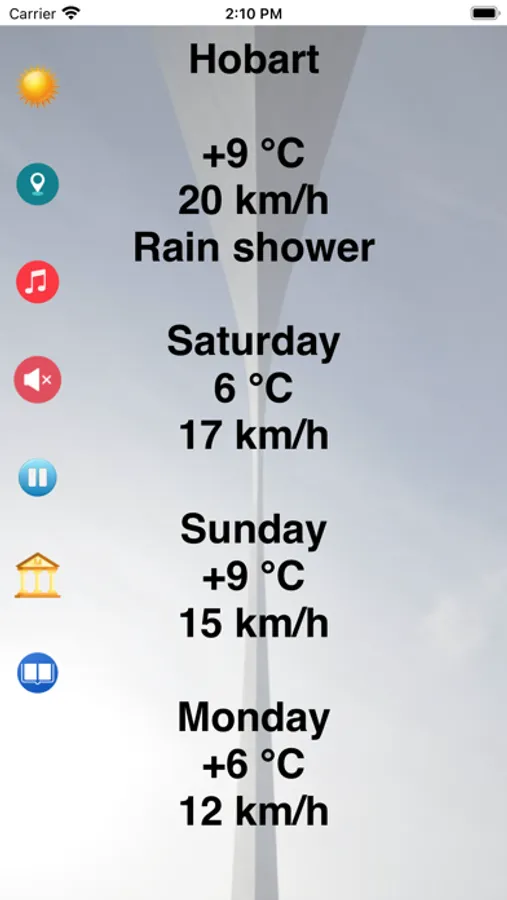 - Button "Weather" (Sun) to show the weather for now and three days ahead