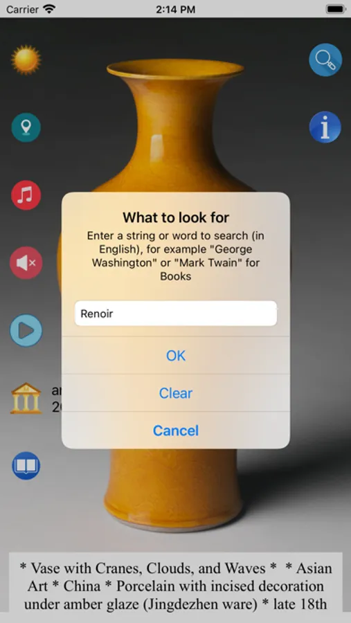 - Button "Search" to search for museum exhibits. Enter an English search string, such as "Auguste Renoir". Click "Clear" to return to a random selection of all exhibits.