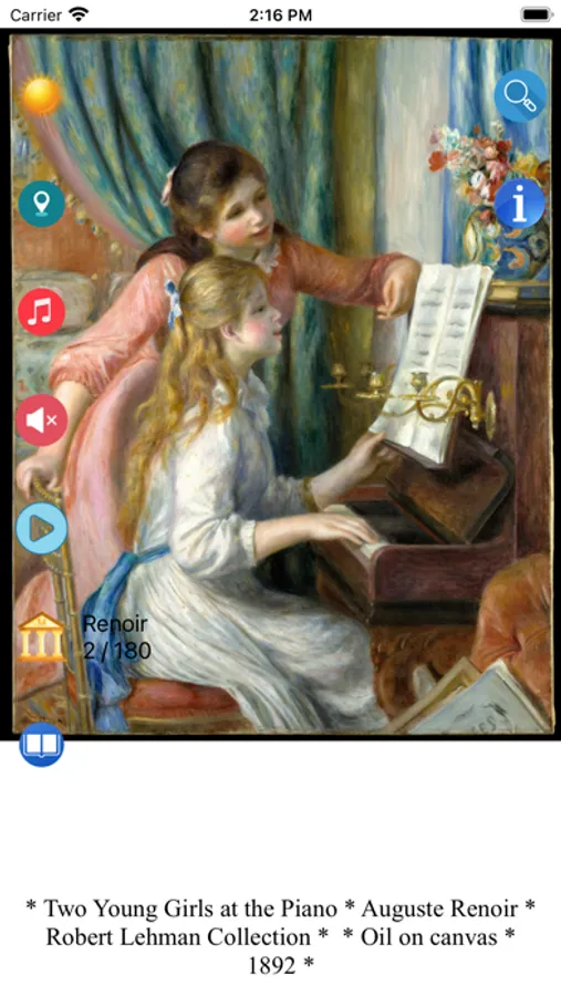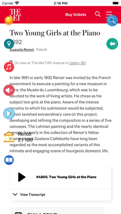 - "Info" button to enter/exit the website of the Metropolitan Museum of Art with detailed information about the exhibit.