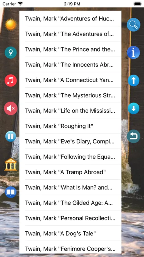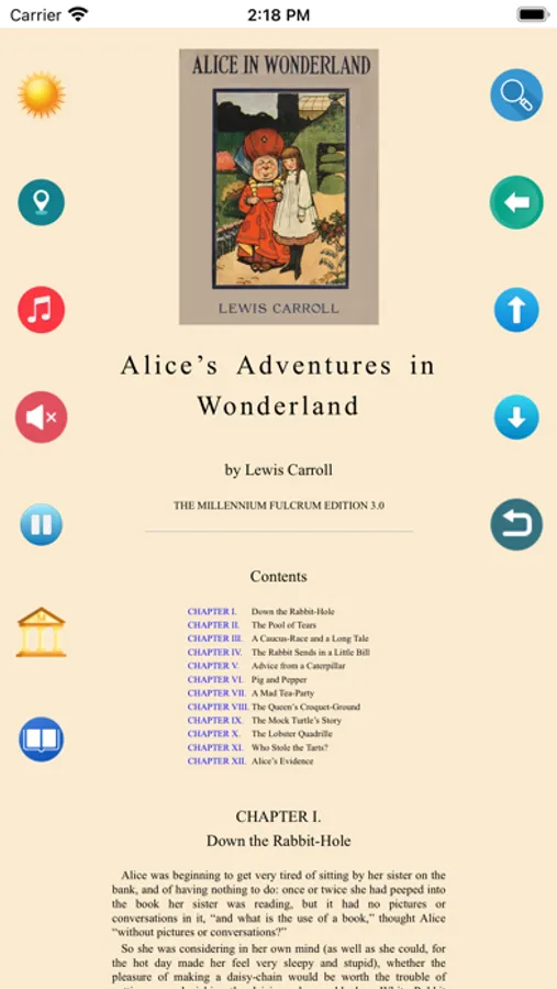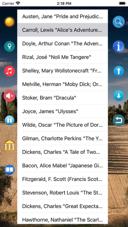 - "Books" button to enter/exit the Gutenberg Library. Select a book from the list and click the "Info" button (i) to open/close this book for reading.