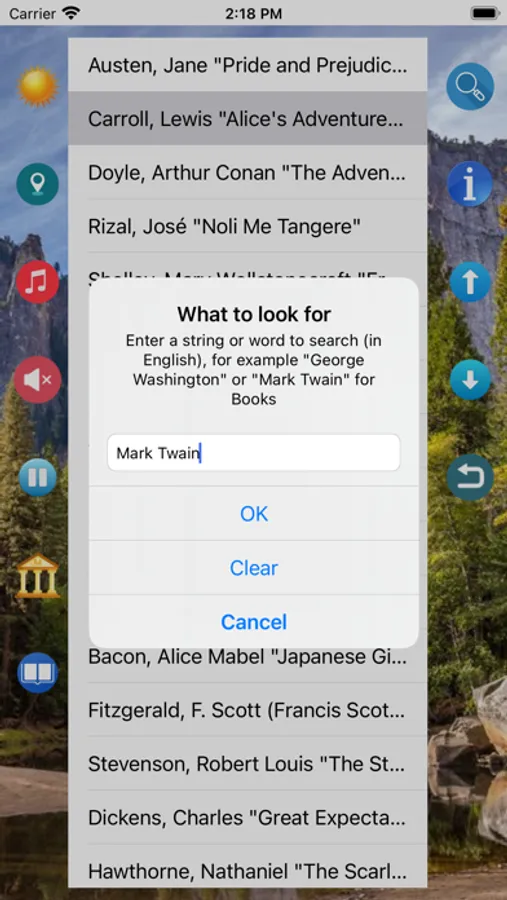 - "Search" button to search for a book. Enter an English search string, such as "Mark Twain". Click "Clear" to return to the full list of all books.