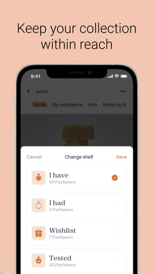 Create different lists of perfumes: I have / I had / Wishlist / Tested / To test.