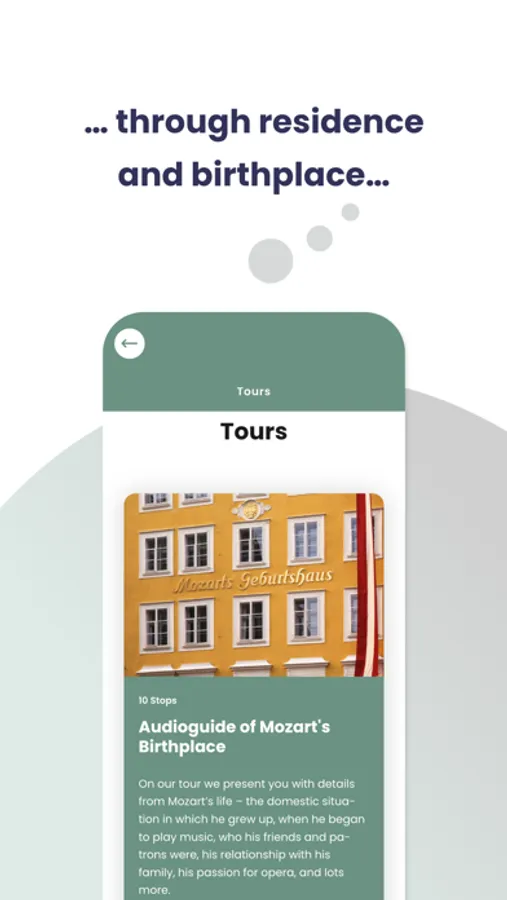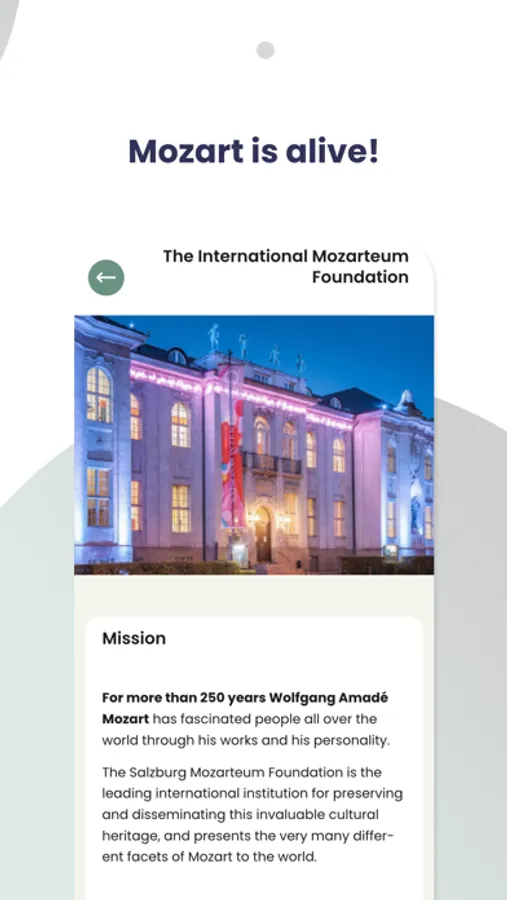 "Discover the fascinating world of Wolfgang Amadé Mozart with this app dedicated to the Mozart Museums of the International Mozarteum Foundation in Salzburg, Austria (Mozart's Birthplace and Mozart's Residence). Accompanied by musical highlights, the app is your digital guide to the world-famous collections of the Mozart Museums. The app provides all the information you need for your museum visit - from information about special exhibitions to admission prices, maps and opening hours. This app is free for all Mozart lovers around the world! The app can be used in the museums or downloaded. It works in offline mode. The easy-to-navigate app is available in many languages and offers interactive experiences for children and families. The accessibility of the app is enhanced by the implementation of the ""two-sense principle"" (reading and listening, to aid barrier-free communication) and tours in German and English in simple language. The app is continuously updated and expanded.