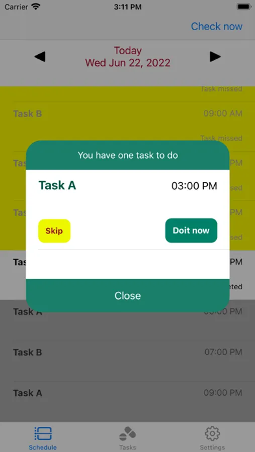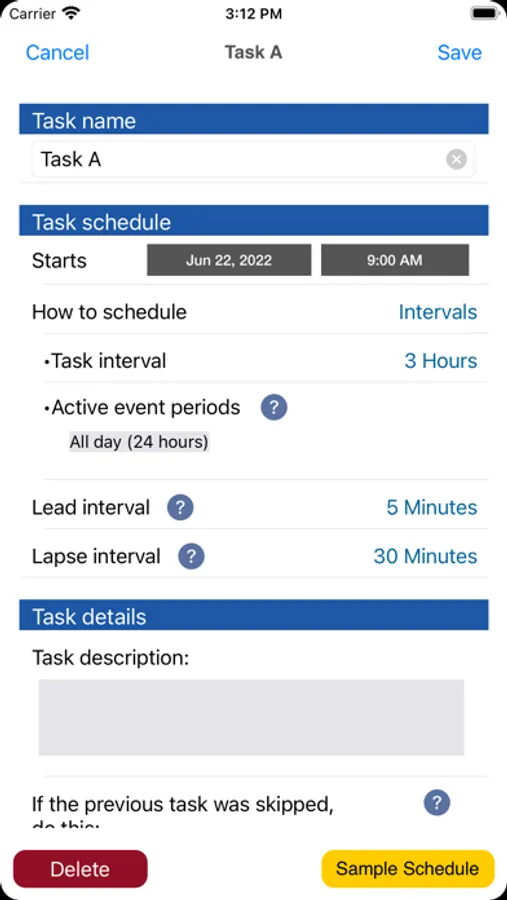 WhenToDoIt is a scheduling app that provides a fast way to produce reminders for a set of tasks. For example, if Task A needs to be performed every two hours, and Task B every three hours, the app will provide an accurate schedule from each task’s start time into the foreseeable future. Similarly, Task C, defined to occur at 9AM and 5PM, will be seamlessly integrated into the other task schedules. The free version allows the user to schedule one task using any of the available scheduling options.