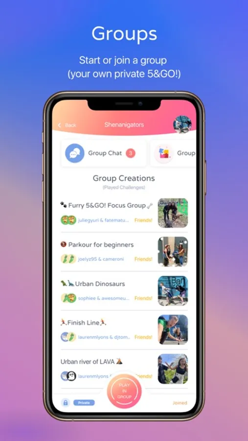 • Start or join a group to play together, choose your challenges, see each other's creations, and chat amongst yourselves. It’s your own private 5 and Go!