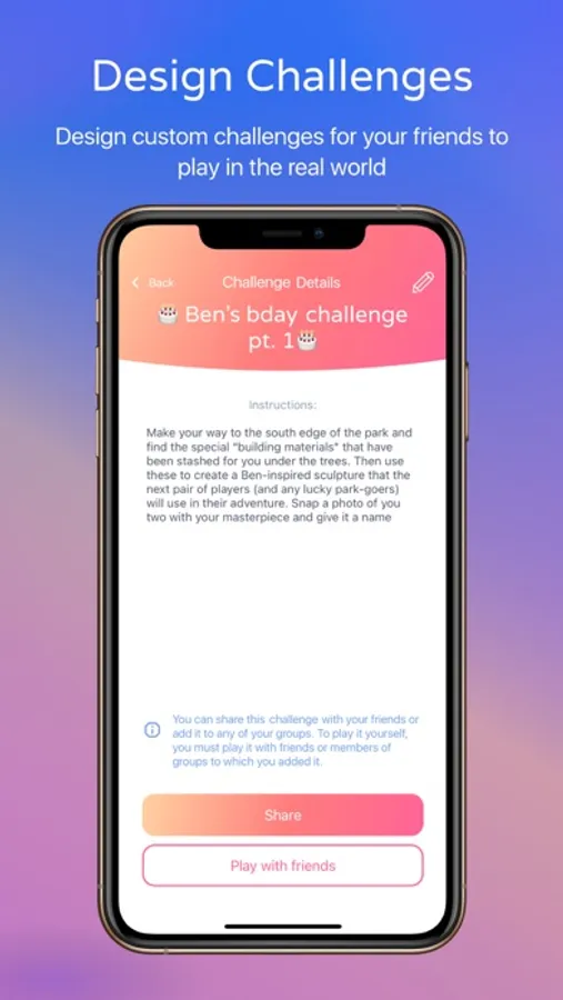 • Design custom challenges for your friends to play in the real world