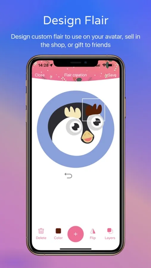 • Design unique flair with the flair editor to use on your avatar, sell to other players in the shop, or gift to friends