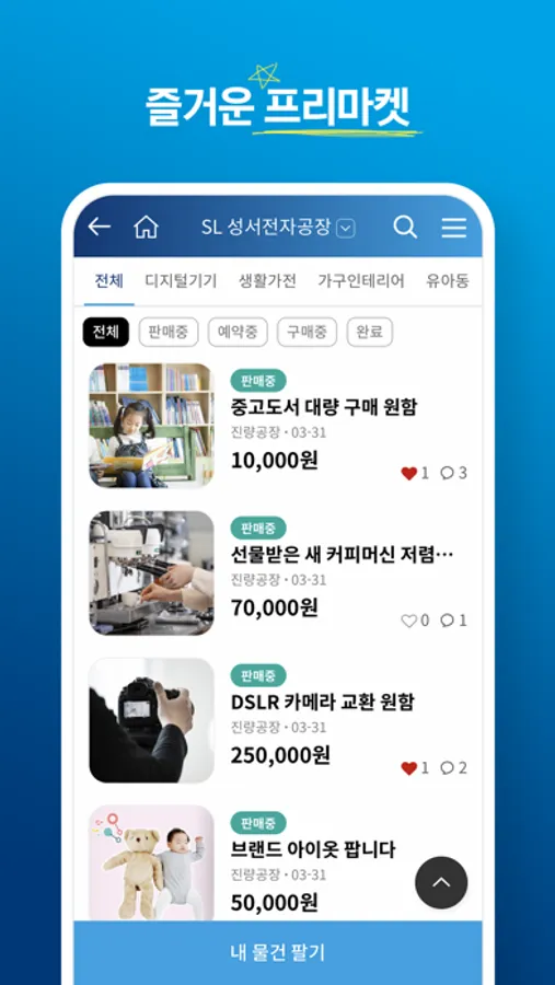 디지털기기, 생활가전, 가구인테리어, 유아동, 생활용품 등 다양한 물건들이 SL 임직원 및 가족들이 공유하고 거래합니다.