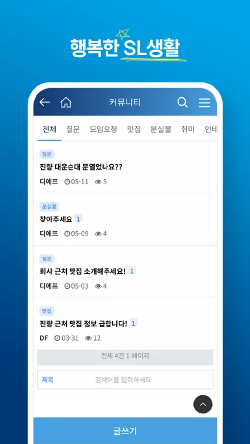 질문, 모임요청, 맛집, 분실물 등 함께 공유해요!