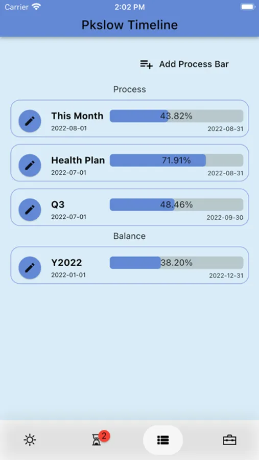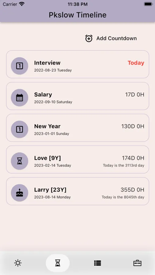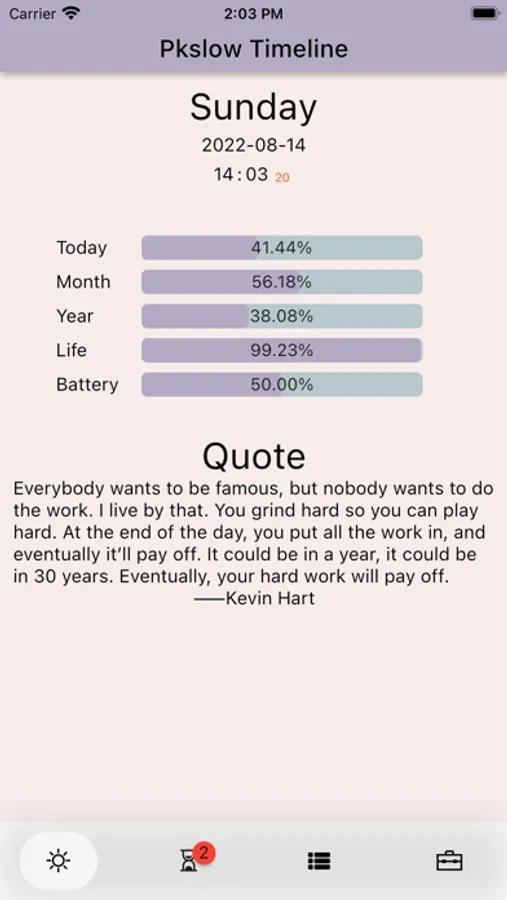 The app can show the balance of today, the battery and your life. You can customize the progress bar and balance bar. What's more, you can add countdowns, supporting type as Once, Anniversary, Birthday, Monthly. The main page will show the quote to you for inspiration. You can chose different themes.