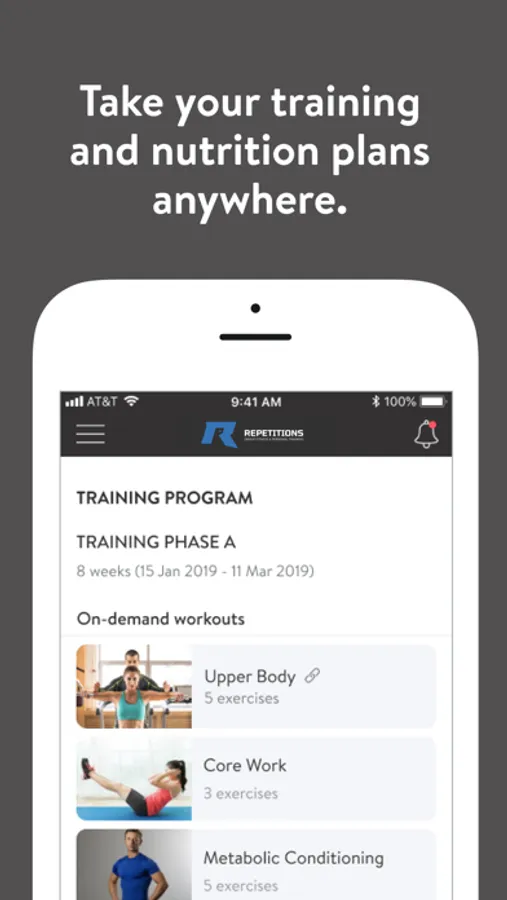 With the Repetitions Fitness App, you will have access to workout programs designed specifically to help you reach your fitness and health goals! You can follow & track your workouts, your nutrition, your lifestyle habits, measurements and results–all with the help of your coach.