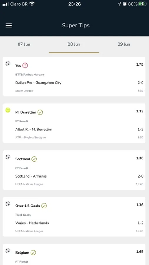 - Many predictions with final result, double chance, btts, over goals, total of sets, handcap and more.