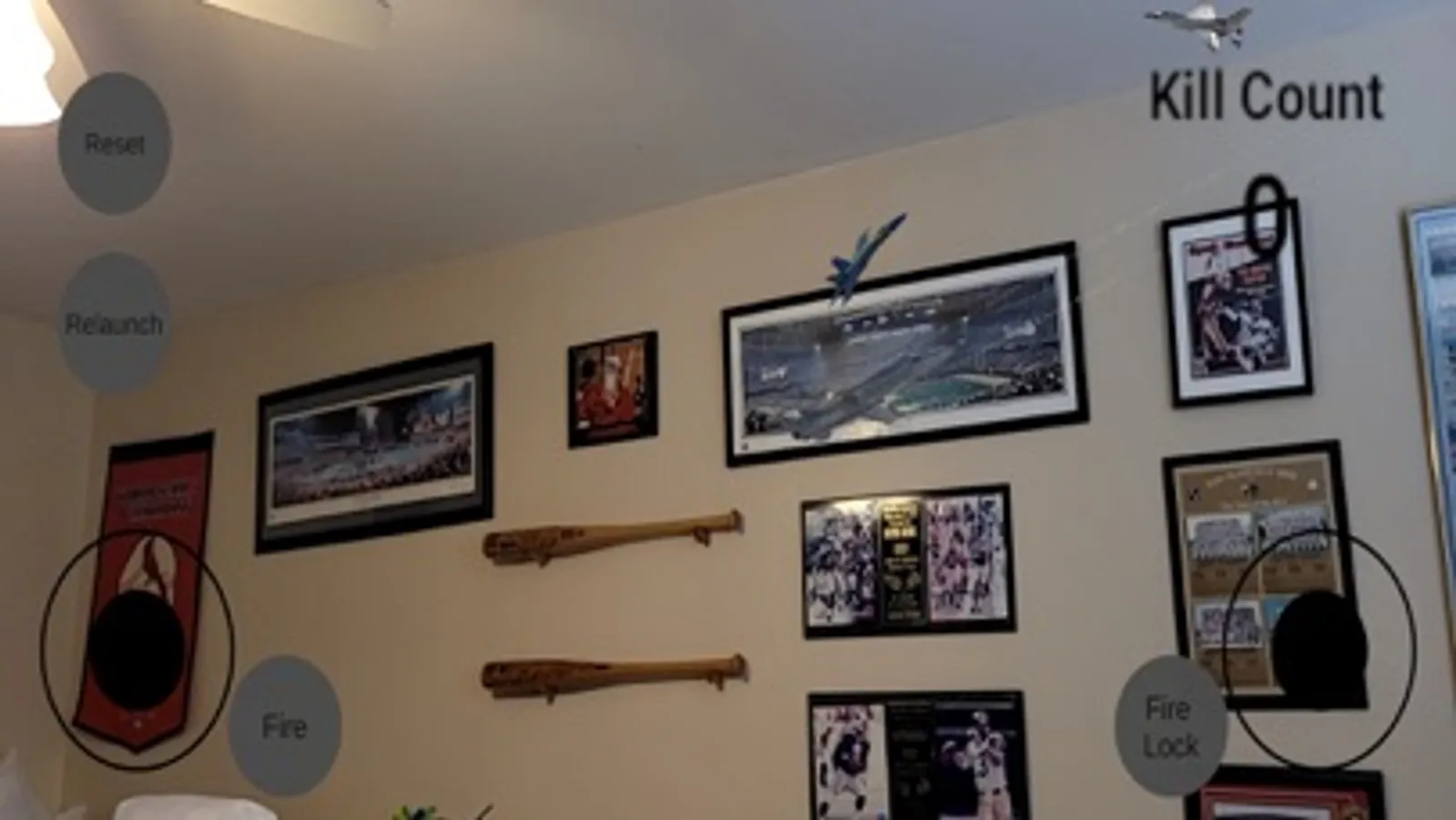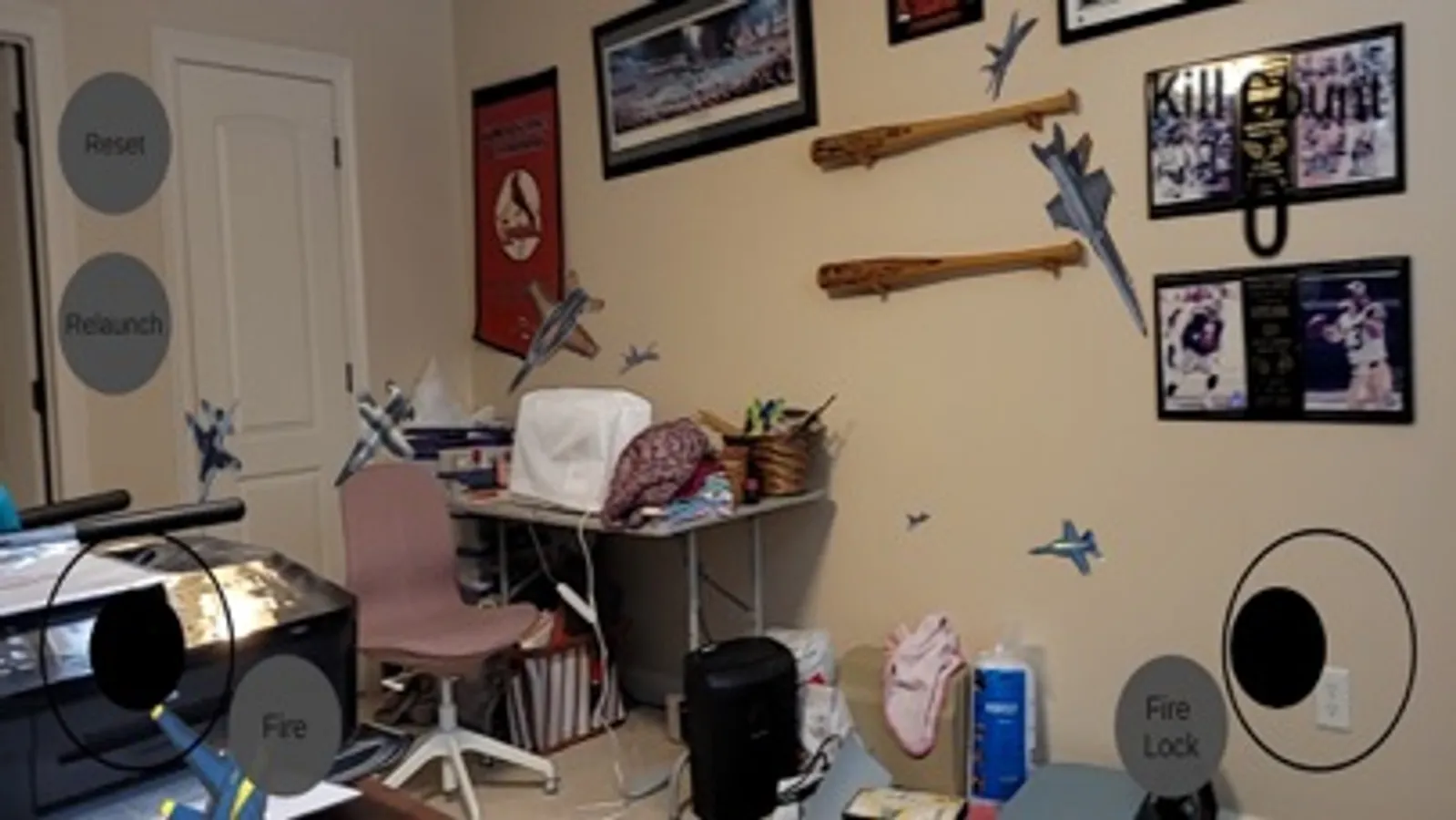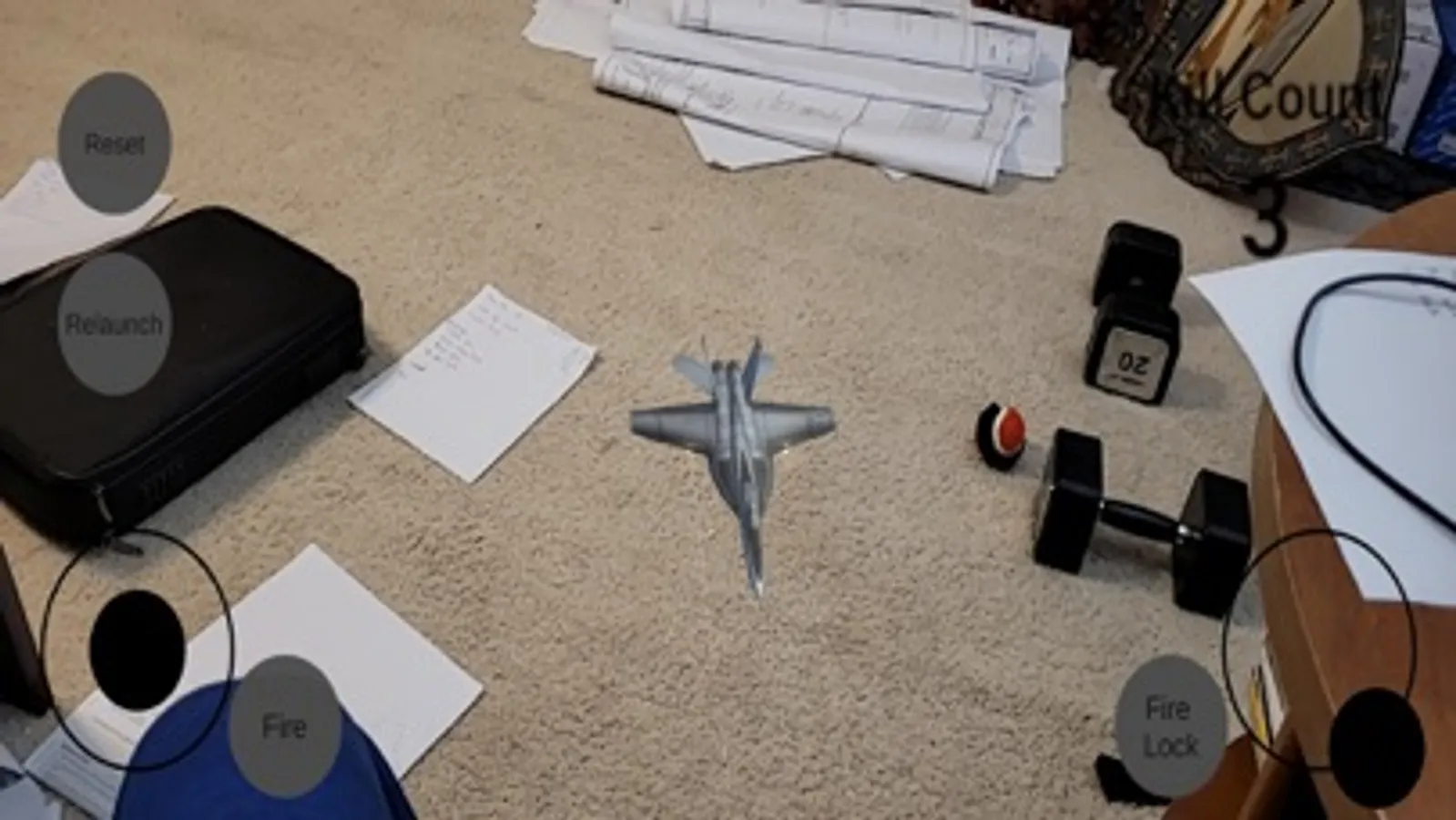 Launch off a Helicarrier and fly an F18 through your house or office with Augmented Reality like a Maverick. Enemy planes are launched off the opposite runway in different time intervals. These enemy planes include F16 Arctic and Thunderbirds and F18 Tiger and Blue Angels. After several minutes your room is filled with fighter jets all gunning for you. How many can you take out with your top gun before they get you. If you lose the plane just hit Relaunch to put it back on the carrier.