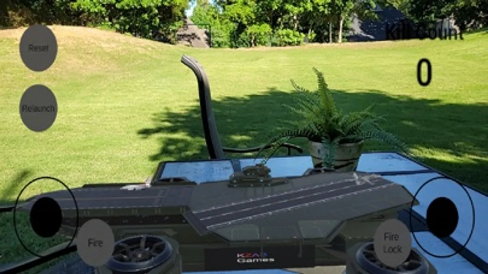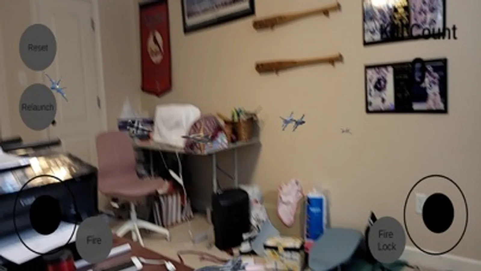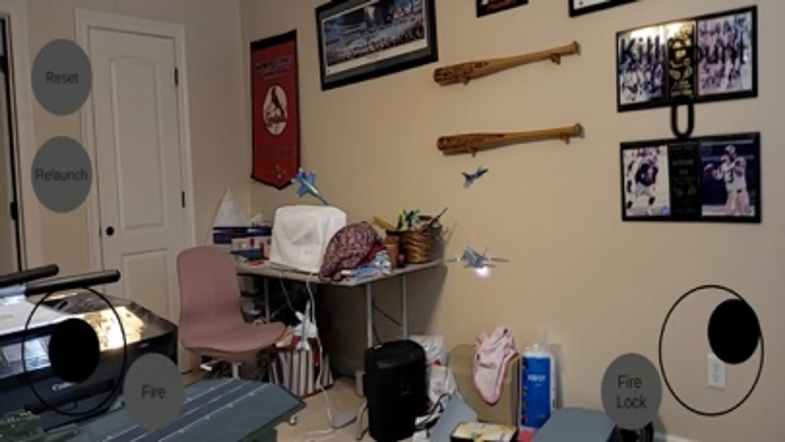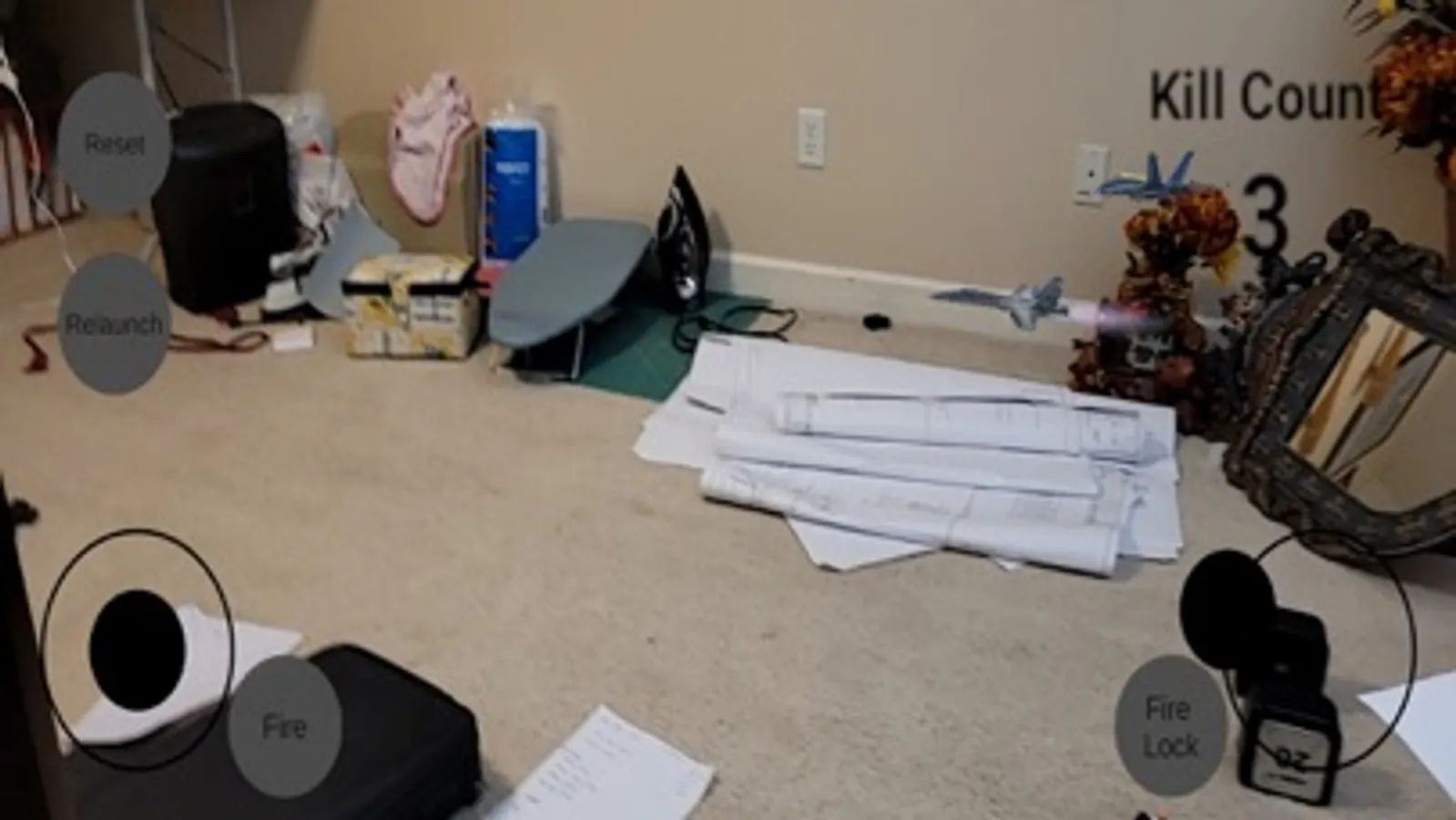 Launch off a Helicarrier and fly an F18 through your house or office with Augmented Reality like a Maverick. Enemy planes are launched off the opposite runway in different time intervals. These enemy planes include F16 Arctic and Thunderbirds and F18 Tiger and Blue Angels. After several minutes your room is filled with fighter jets all gunning for you. How many can you take out with your top gun before they get you. If you lose the plane just hit Relaunch to put it back on the carrier.