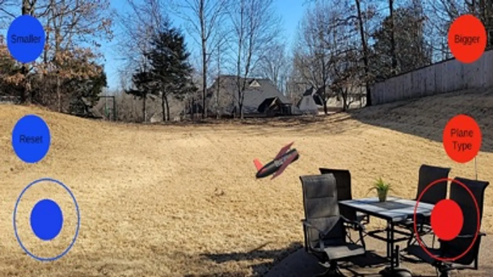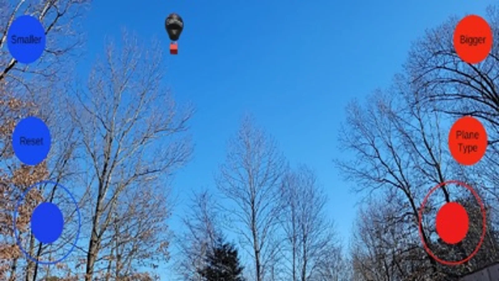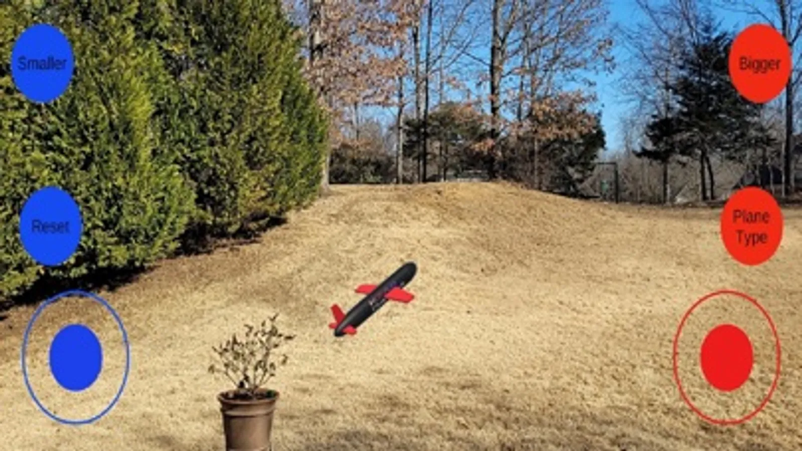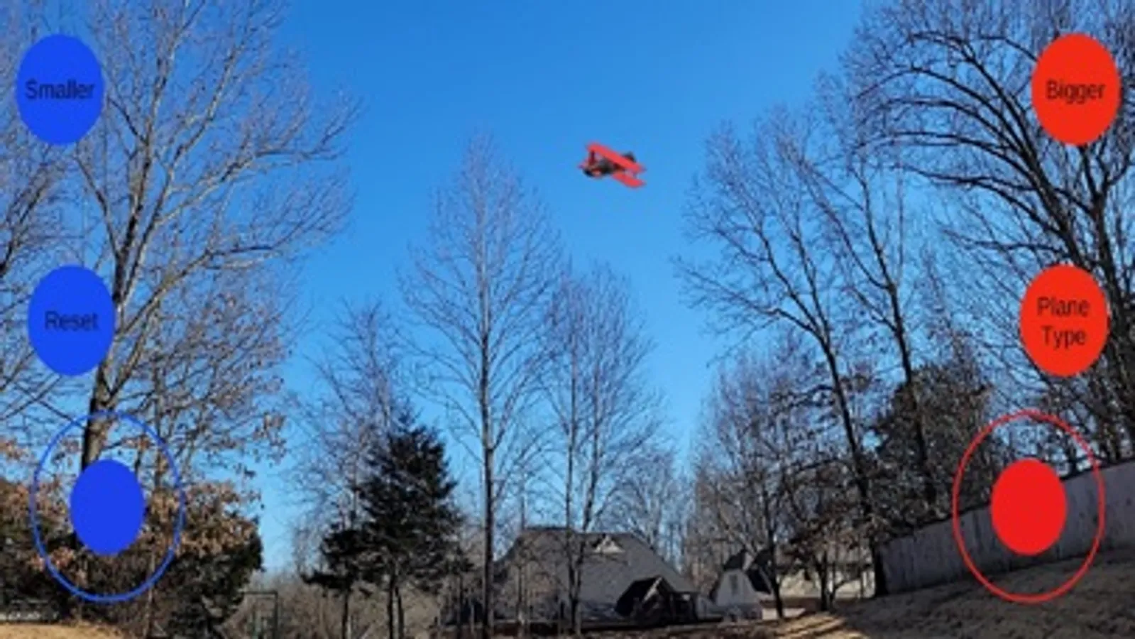 This AR app contains four different aerial vehicles that can be flown around your house, office, or other locations through your phone. These vehicles include a regular airplane, a fighter jet, a biplane, and a hot air balloon piloted by two teddy bears. The right joystick controls the speed and yaw of the vehicle, while the left control stick controls the pitch and roll of the vehicle. The top buttons can make the vehicle larger or smaller. The right center button changes the type of vehicle, and the left center button can reset the plane back near your location. You may have to turn around to find it at times though.