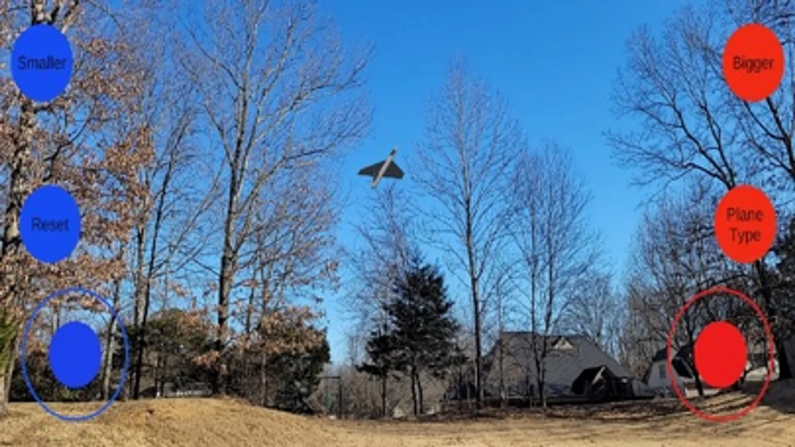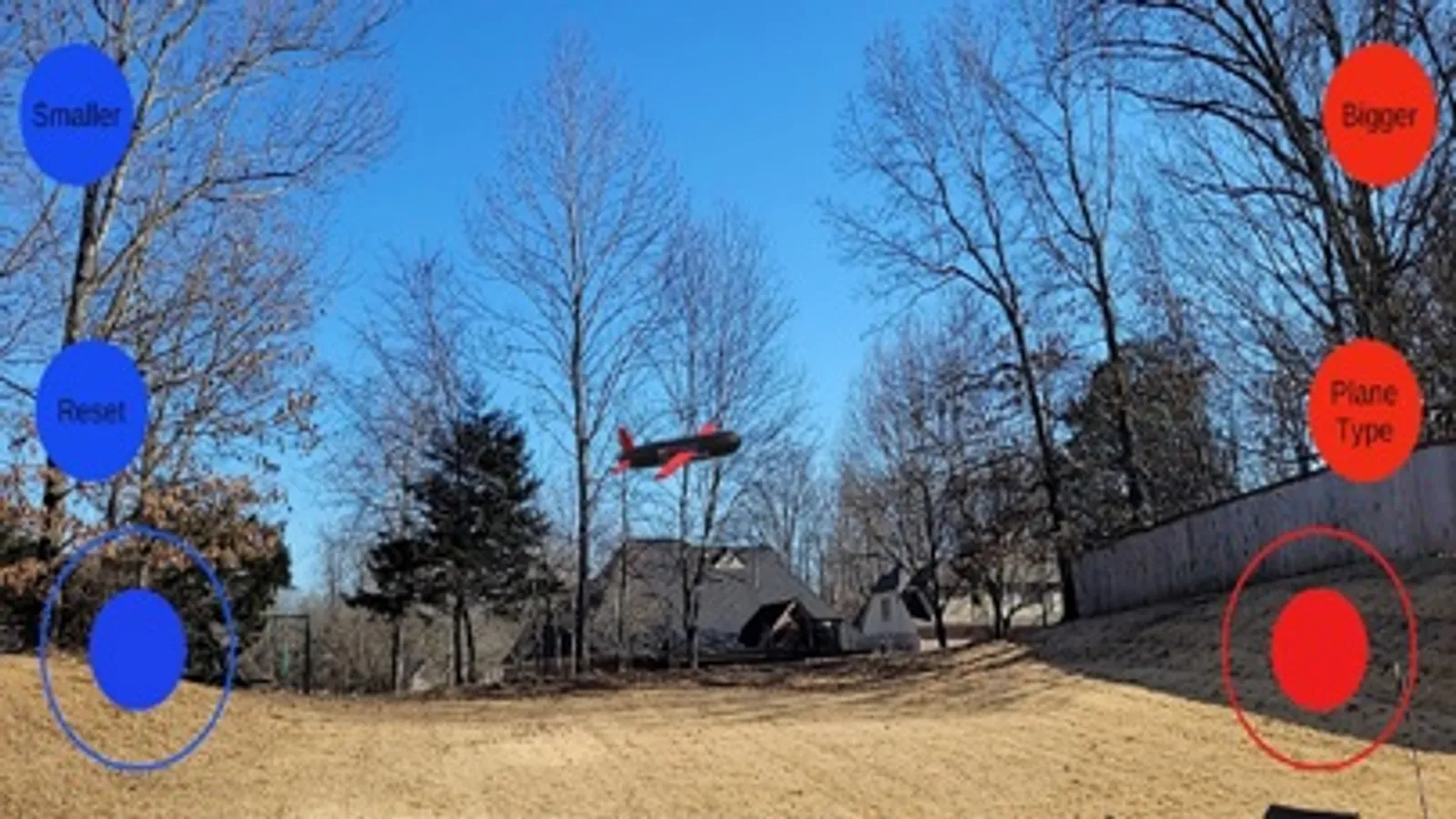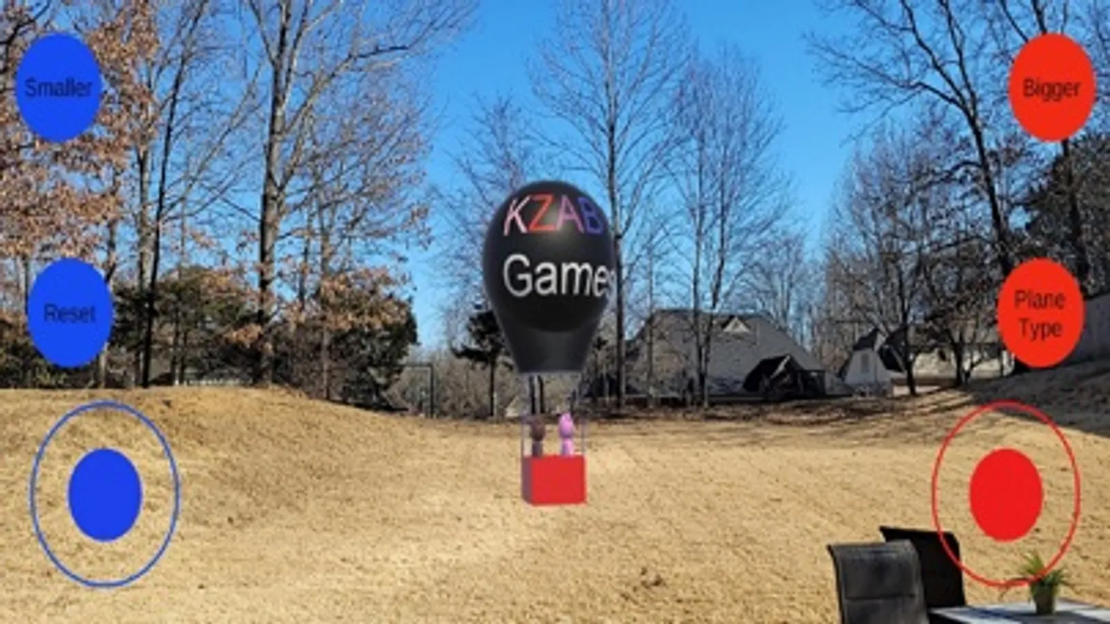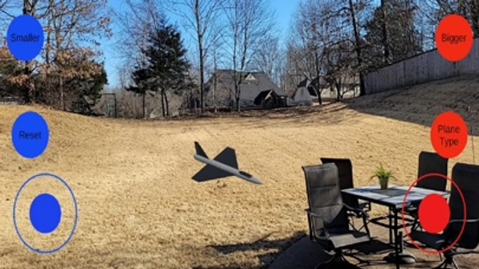 This AR app contains four different aerial vehicles that can be flown around your house, office, or other locations through your phone. These vehicles include a regular airplane, a fighter jet, a biplane, and a hot air balloon piloted by two teddy bears. The right joystick controls the speed and yaw of the vehicle, while the left control stick controls the pitch and roll of the vehicle. The top buttons can make the vehicle larger or smaller. The right center button changes the type of vehicle, and the left center button can reset the plane back near your location. You may have to turn around to find it at times though.