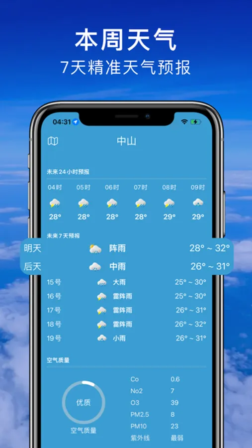 - 天气:为您提供24小时的逐小时精准天气预报、7天预报、气温、空气质量、生活建议等;