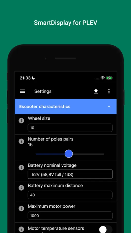 You'll have full control of your SmartDisplay device from your phone : speed, power, brake force, light, errors ...
