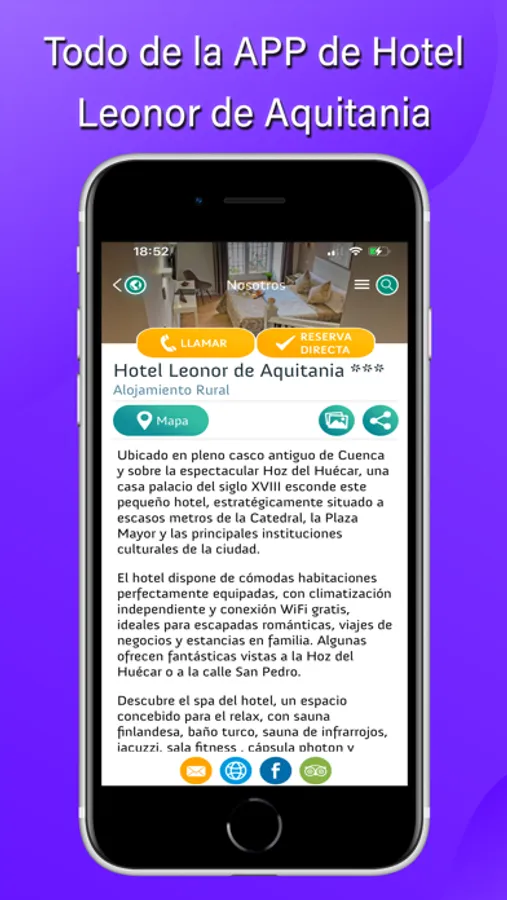 Con nuestra app podrás conocer de primera mano una guía en formato digital configurada como oficina virtual de turismo sobre Hotel Leonor de Aquitania y su entorno, rutas guiadas por GPS, naturaleza, actividades e itinerarios especiales, propuestas gastronómicas, culturales y de ocio.
