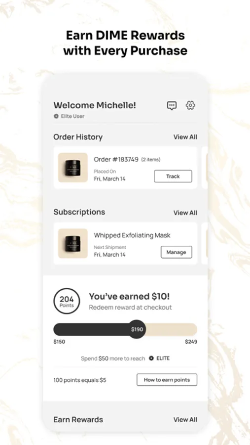 Earn rewards points just for downloading the app! Then, with every purchase made, rewards points are automatically added to your account. Keep track of your DIME rewards points on your personal profile, and use them to redeem discounts on purchases.