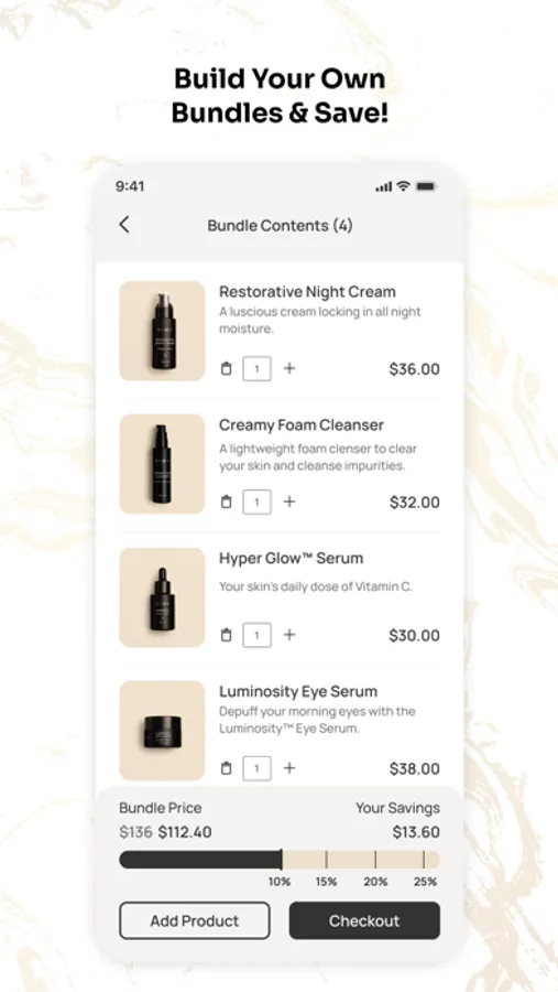 Our app allows you to create any custom bundle to perfectly fit your skin’s unique needs. Love an existing bundle but want a different moisturizer? Just view any bundle and tap “customize” to make it your own. Already know your skincare routine and want to build it from scratch? Use our bundle builder to create your own skincare routine.